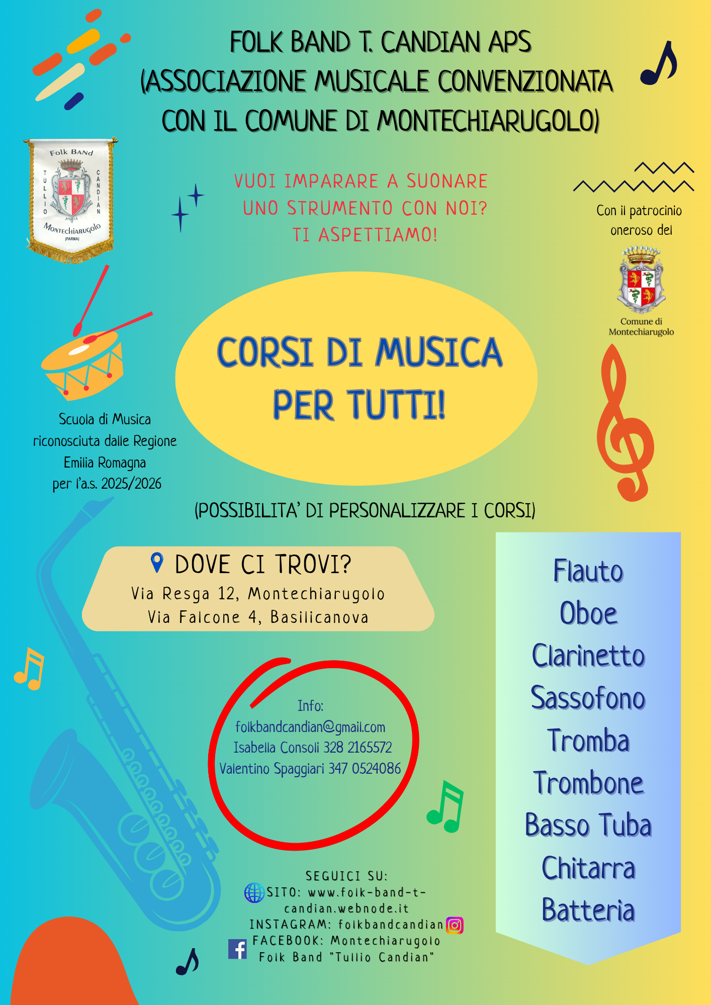 Corsi di musica per tutti: per imparare a suonare uno strumento (flauto, oboe, clarinetto, sassofono, tromba, trombone, basso tuba, chitarra, batteria). Possibilità di personalizzare i corsi.