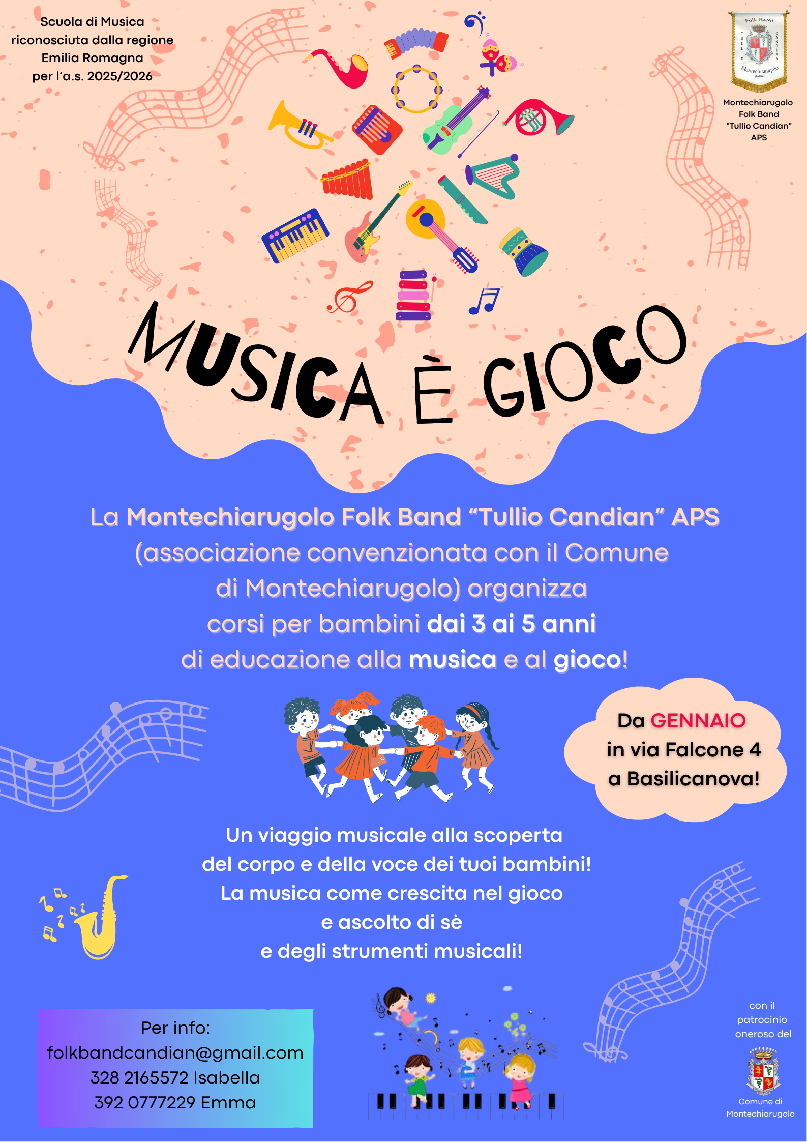 Musica è gioco: da gennaio 2026 la Montechiarugolo Folk Band T. Candian organizza corsi per bambini dai 3 ai 5 anni di educazione alla musica e al gioco.