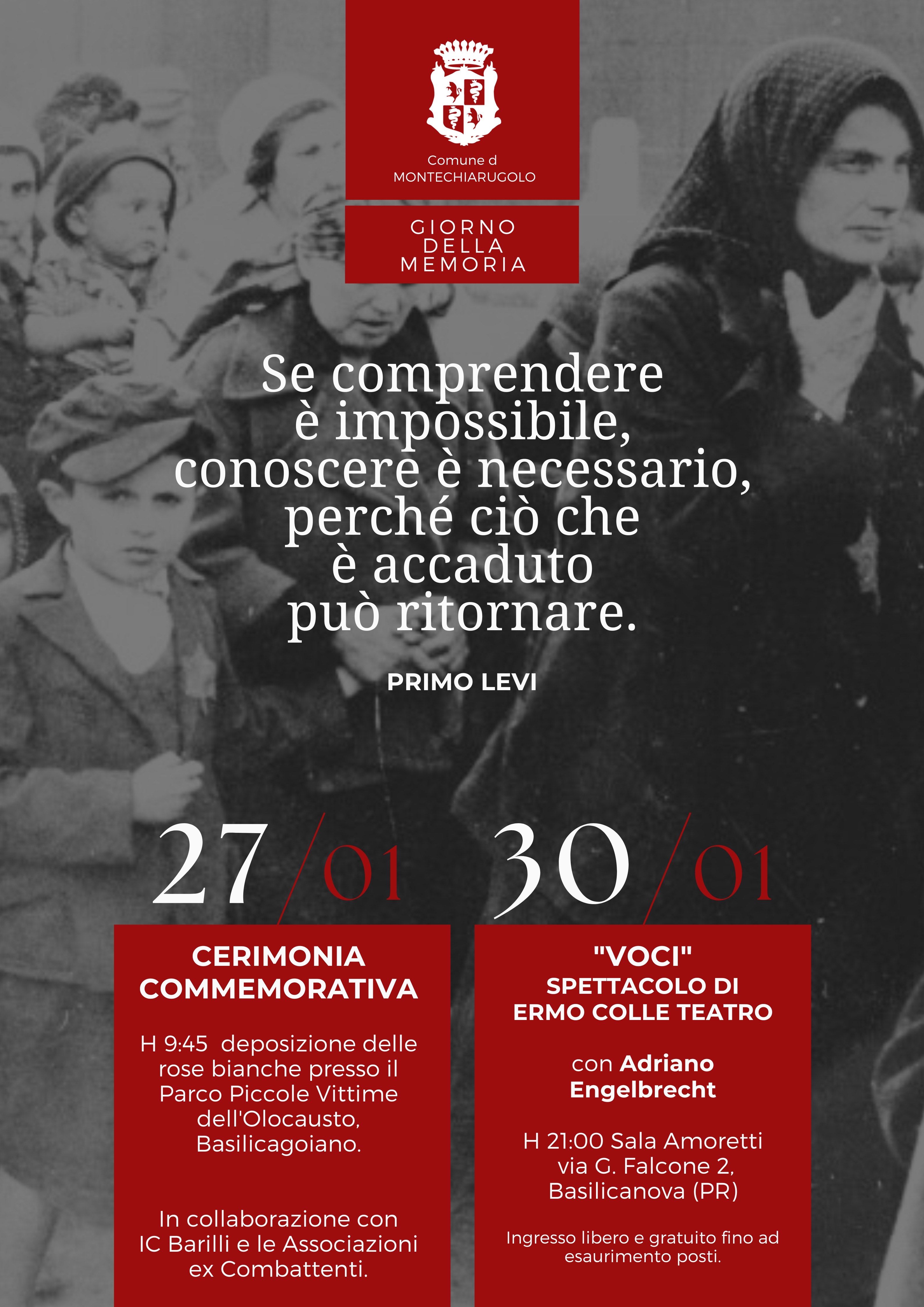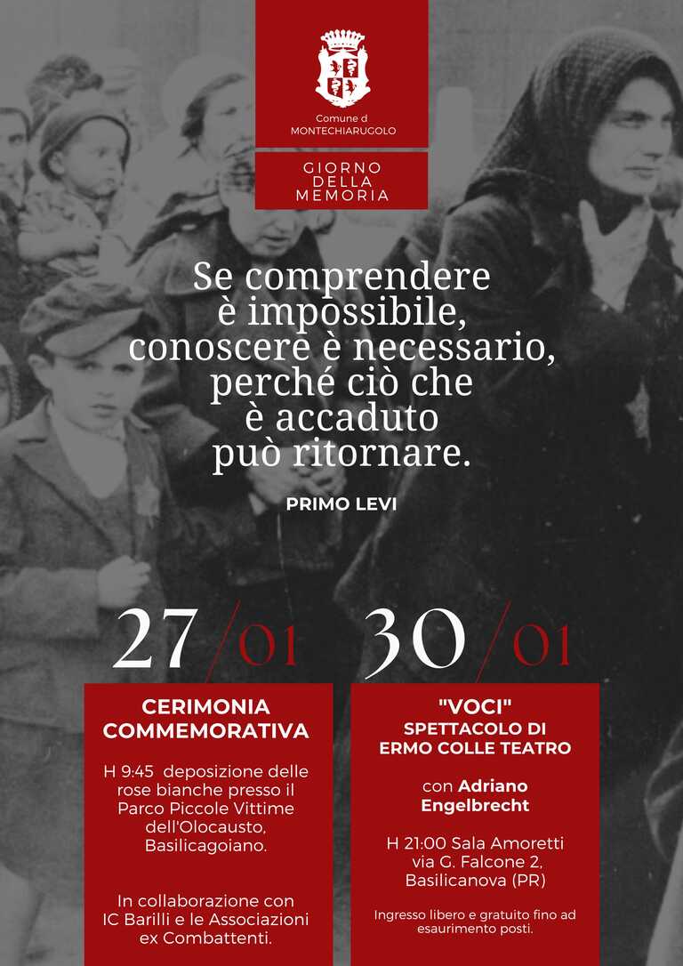Nella mattinata di martedì 27 gennaio, presso il parco Piccole Vittime dell’Olocausto di Basilicagoiano, in collaborazione con l’IC Barilli e le Associazioni ex Combattenti, alla presenza del Sindaco e dei rappresentanti dell’Amministrazione Comunale, verrà effettuata la deposizione di n. 6 rose bianche e si terrà una breve cerimonia commemorativa altrettante piccole vittime (dai 2 ai 14 anni) che non fecero mai ritorno dal campo di sterminio di Auschwitz: Roberto, Liliana e Luciano Fano, Cesare Davide e Donato “Tato” Della Pergola, Roberto Bachi. Contestualmente sarà deposto un omaggio floreale presso le pietre di inciampo posizionate davanti al Municipio di Montechiarugolo, in memoria dei cittadini del Comune di Montechiarugolo deportati in campi di sterminio nazisti.