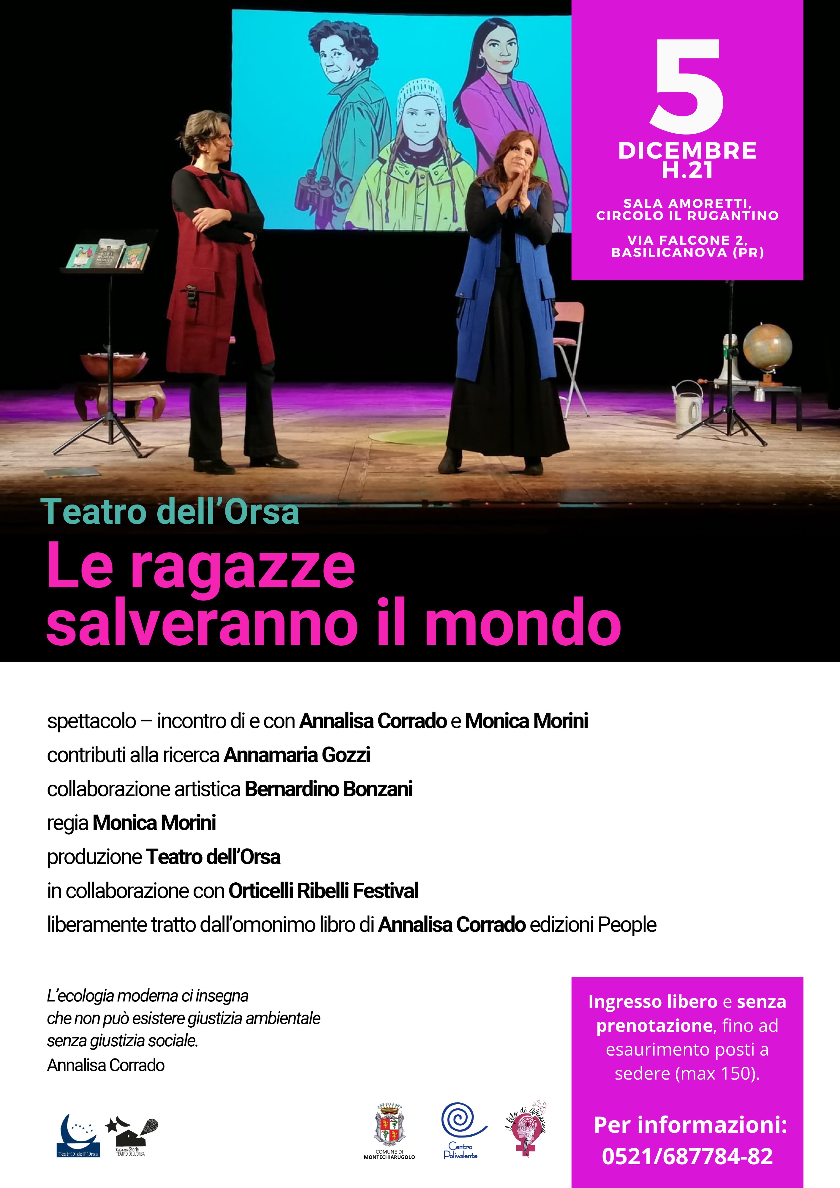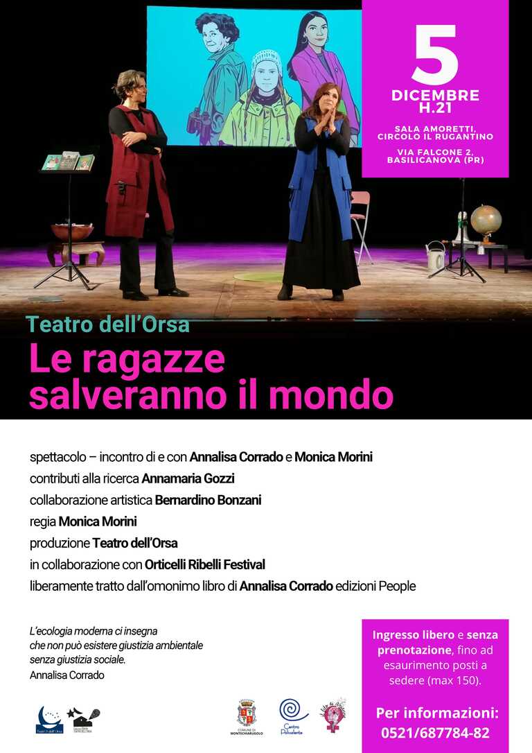 Venerdì 5 dicembre 2025 alle ore 21.00, presso la Sala Amoretti di Basilicanova, si terrà lo spettacolo teatrale "Le ragazze salveranno il mondo" dell'associazione Teatro dell'Orsa.