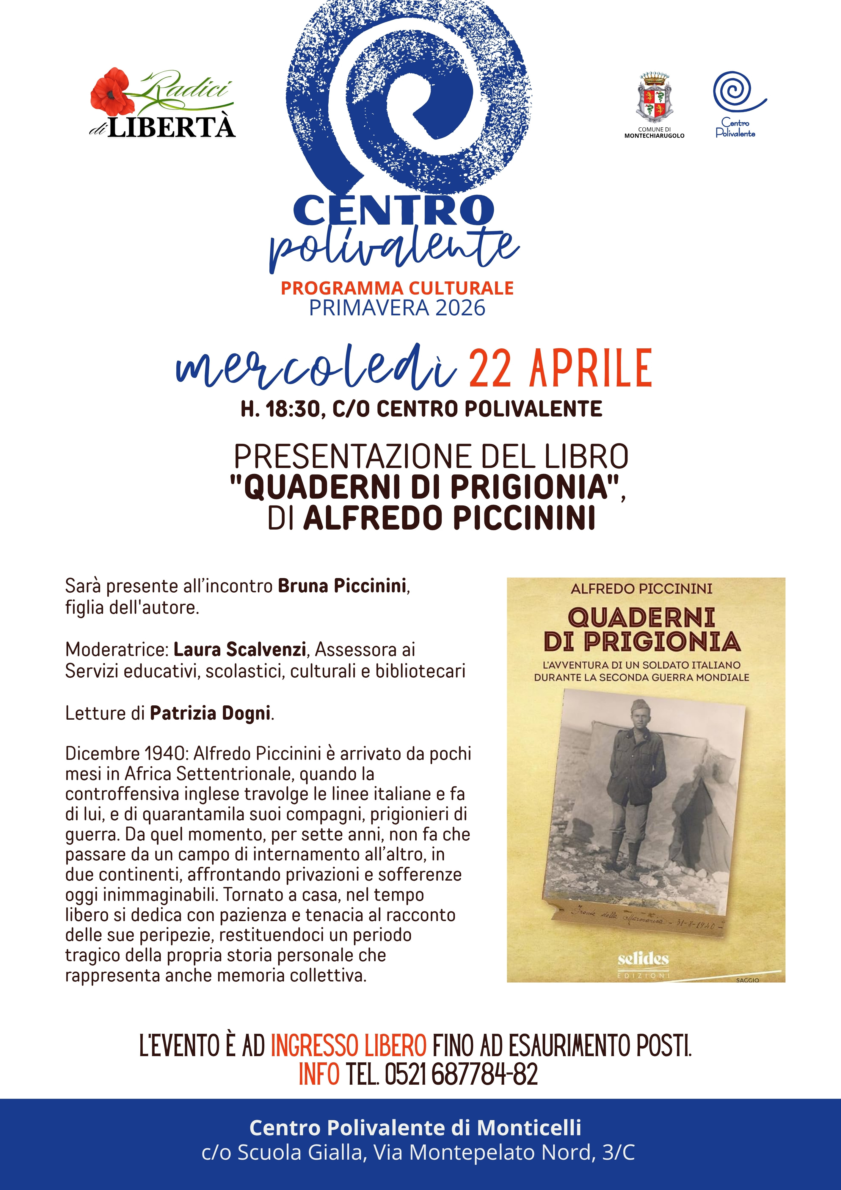 Mercoledì 22 aprile alle ore 18.30, presso la Biblioteca comunale di Monticelli Terme, verrà presentato il libro "Quaderni di prigionia" di Alfredo Piccinini.